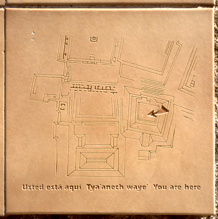 Detail of plaque at left; ground plan; arrow indicates location of Great Pyramid; Dovecote Group Acropolis shown at left.