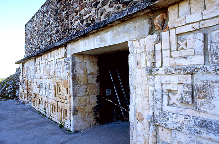 Looking east across front of restored facade, showing fallen upper level frieze, width of doorjamb, and reinforced concrete lintels. Jan. 2003 (24mm lens)