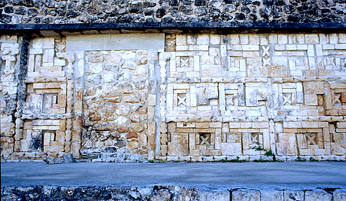 Section of facade between left end and central doorway; showing left doorway with reinforced concrete lintel filled in.