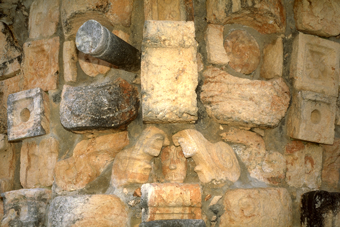 Showing upper mask with only unbroken tubelike projection and small head framed by profiles possibly of birds heads.