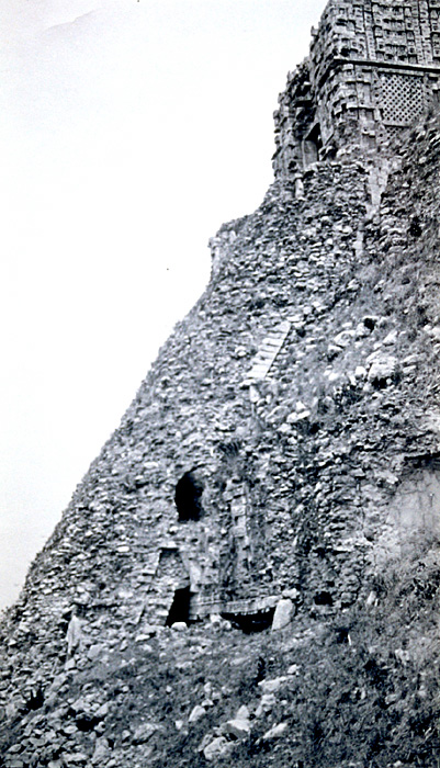 1923. West face: right side of staircase with Temple IV at top. Scanned from slide taken of original photograph by M. H. Saville; reproduced Courtesy of The Division of Anthropology, American Museum of Natural History.