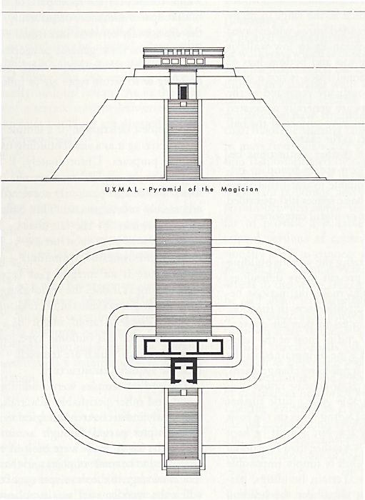 "Uxmal-Pyramid of the Magician" (elevation and plan). Scanned from George F. Andrews, Maya Cities, Placemaking and Urbanization, 1975, p 40. Reproduced with permission of the University of Oklahoma Press.