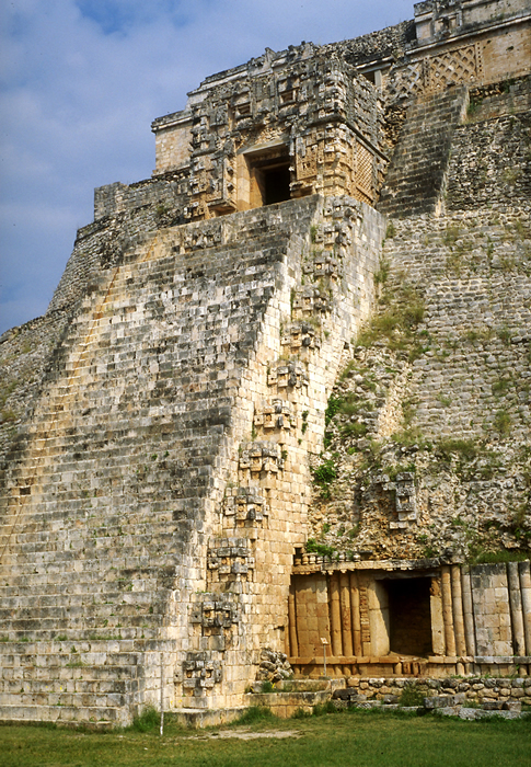Stepped flight of 12 masks on each side of stairs, set back from stair steps; also showing rare surviving portions of Temple I. Nov. 1999