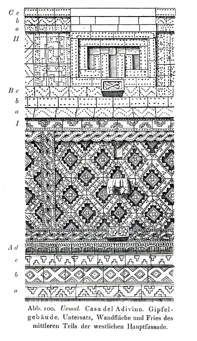 "Fig. 100. Uxmal. House of the Magician. Summit building. Undersatz. Wall surface and frieze of the middle section of the western main facade."