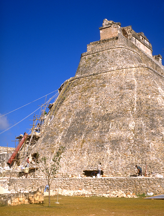 Consolidation in process on southwest corner and above south base; stone base encircling pyramid is an earlier hypothetical reconstruction. Jan. 2002