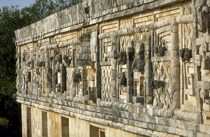 Looking at extreme angle along left (south) 2/3 of frieze, showing continuous bodies of 2 long serpents, separate horizontally, intwined vertically. Most of this section of the facade has been reconstructed. |