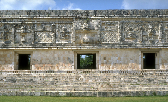 Front facade with doorways 3, 4, and 5 (4 is the wider central doorway); showing two long, intertwined serpents, helping to unify facade.