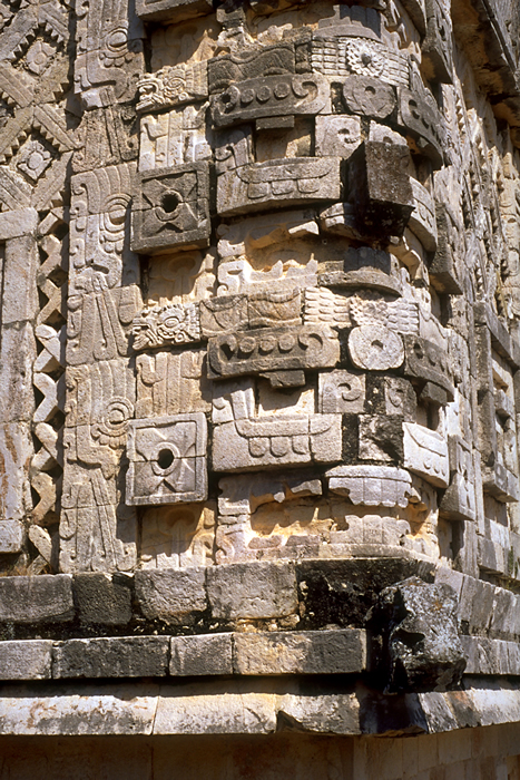 Corner mask stack, lower section; showing elaborate serpent motifs in mask stack and projecting head at corner of medial molding. Jan. 2001