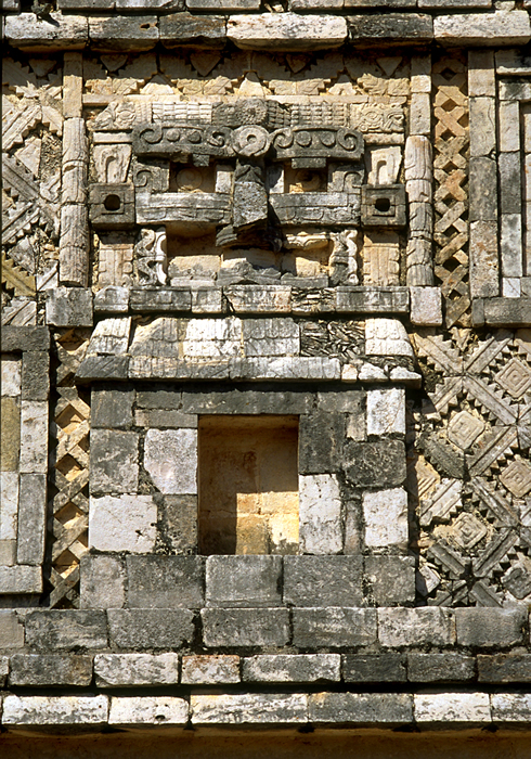 Traditional Yucatec domestic hut, with mask wearing feathered serpent headband with central flower, entirely restored, over doorway no.1.