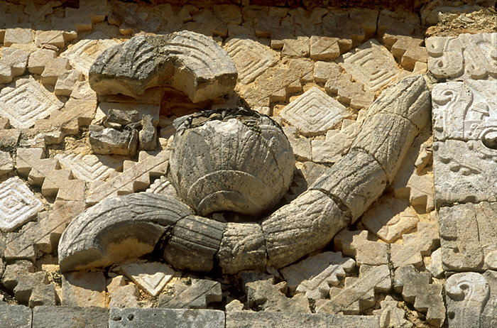 The end of the upper snake with rattle missing, a tuft of feathers on the end of the tail (cf. page 7 for a better preserved tuft on the end of the other snake); entirely restored.