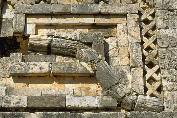 The end of the lower snake with head missing. These details also show that the snake was feathered; entirely restored. Jan. 2001