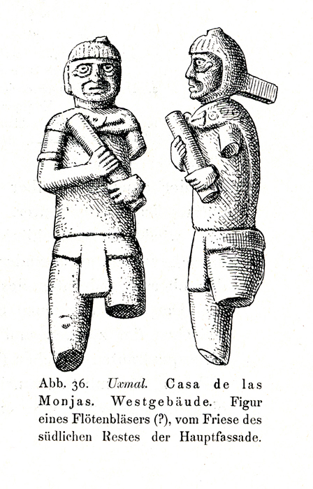 "Fig. 36. Uxmal. House of the Nuns. West building. Figure of a flute blower (?), from the frieze of the southern remnants of the main facade."