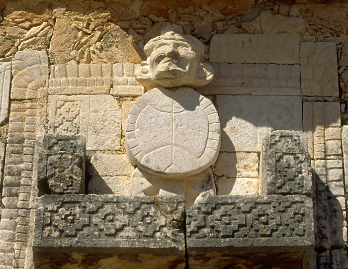 Aged turtle-man earth deity standing on throne, his body a broad, circular, but surprisingly flat turtle shell
