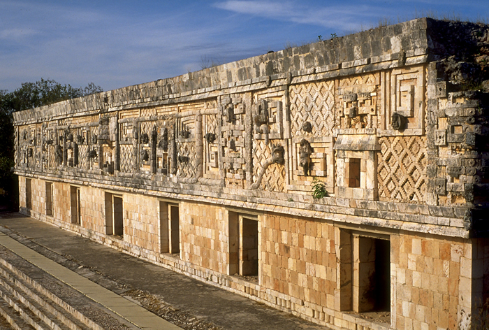 Looking along front facade, showing elaborate, 3-dimensional frieze, plain lower tier with inset doorways; some sections entirely restored (cf. 1895 drawing at left). Jan. 2001