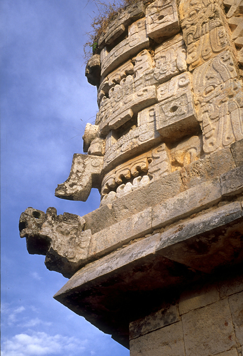 Lower portion of mask stack on northeast corner of West Building, with serpent head projecting from medial molding.