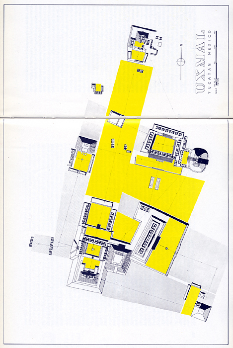 "Uxmal, Yucatan, Mexico". Site plan of "central ceremonial precinct"; courtyards and "interconnected plazas" shown in yellow.