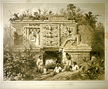 All the illustrations of Uxmal, Kabah, Sayil, and Labná in Frederick Catherwood's folio volume, Views of Ancient Monuments in Central America, Chiapas, and Yucatan (London: F. Catherwood, 1844). Prints in this volume were made under Catherwood's supervision and based on his highly accurate drawings done on site 1839-42. In contrast to the previous publications of his drawings, however, these prints (chromolithographs) were glamorized and, in some cases, the architecture was straightened and slightly reconstructed. The images on this web site were scanned from 35mm slides I have taken of the copy in the Library of the AMNH (RF-13-K). Reproduced Courtesy of The Library, Special Collections, American Museum of Natural History.