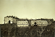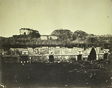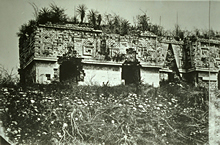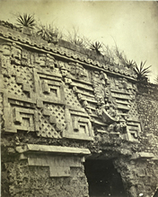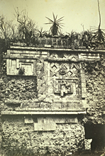 All the photographs of Uxmal (there are no images of Kabah, Sayil, or Labná) included in Claude Joseph Désiré Charnay, Cités et Ruines Américaines, published in 1862-63. Charnay's photographs were mounted in Vol. 1, the lavish folio volume, published 1862. These and other photographs taken in 1859 and 1860 by Charnay are the earliest photographs of Maya ruins. The text was printed in a small accompanying volume, published 1863, which included an essay by Viollet-le-Duc, with a few diagrams reproduced below. The images on this web site were scanned from 35mm slides I have taken of the copy in the Library, Special Collections, of the AMNH (RF-106-D). Reproduced Courtesy of The Library, Special Collections, American Museum of Natural History.