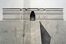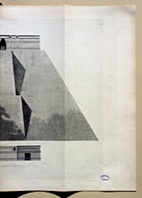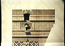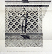 Pl. 11. "Study of a part of the Pyramid of Kingsborough" (Pyramid of the Magician, Temple V; area of the front facade directly left of the doorway, including the imagined form of a standing male sculpture).