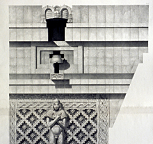 Detail of print at left, showng front facade of Temple V, with 4 imagined figures.