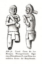 "Fig. 36. Uxmal. House of the Nuns. West building. Figure of a flute blower (?), from the frieze of the southern remnants of the main facade."