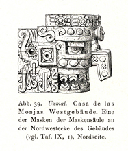 "Fig. 39. Uxmal. House of the Nuns. West building. One of the masks of