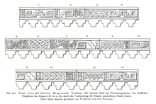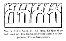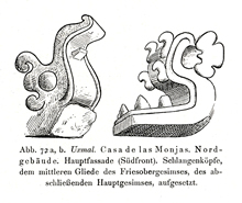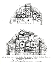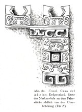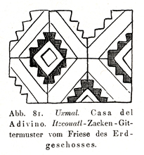 All the illustrations of line drawings of Uxmal in Eduard Seler's monumental study, "Die Ruinen von Uxmal," published in Abhandlungen der Königlich Preussischen Akademie der Wissenschaften. Philosophisch-Historische Klasse, Nr. 3. Berlin: Verlag der Königl. Akademie der Wissenschaften, 1917. The more elaborate drawings are signed by Wilhelm von den Steinem and most of the other drawings are consistent with his hand; based on on-site drawings by Seler and other material. I have scanned these images from the copy in the University of Rochester Library, with appreciation. On this web site, the captions are literal translations of the German caption. |