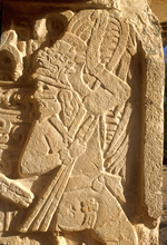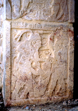 photo at left, possibly representing triumphal celebration; left figure possibly a King of Kabah, the right figure with facial scarification wears a