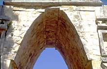 Angled view of frieze at right side of archway, showing three-dimensional character.