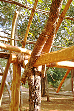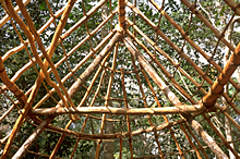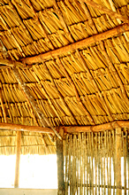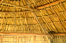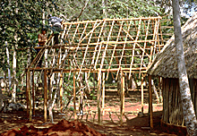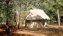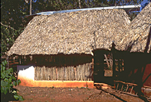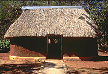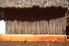 house, showing local clay covering of pole and stick walls, protected from moisture by limestone-mortar base.