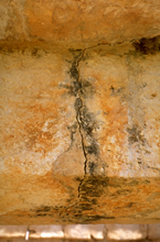 2nd doorway from left, geometric mask above; staircase reconstructed.