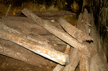 Decayed wooden lintels, possibly originals, removed from doorways, stored in room on south side of South Building.