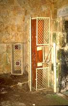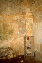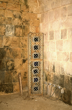 Wall beside door with typical cordholder. Cordholders were located just below springing of vaults, beside doorways, to hold poles or ropes, from which curtains could be hung.