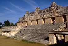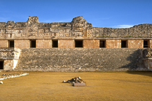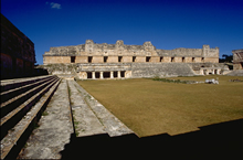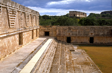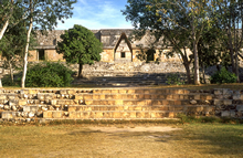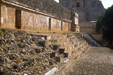 Low staircase up to front of the South Building of the Nunnery. The central portion of this broad staircase has been reconstructed and restored for tourists.