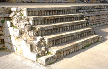 Side view of the same lower stairs showing ceremonial placement of stele.