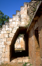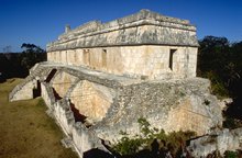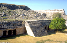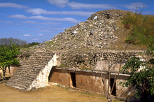 Codz Poop Platform: Main (west) staircase, lined up with center of Codz Poop facade above; altar on ground level, not centered.