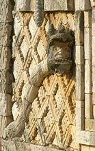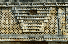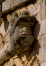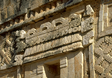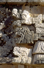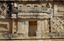 North Building, front frieze: Originally, on all sculptures of traditional Yucatec domestic huts, all recessed doorways presumably held sculptured figures.