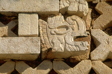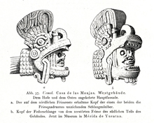 the courtyard and the east. a. The remaining head on the northern frieze remnants of one of the two serpent bodies surrounding the frieze quadrant. b. Head of the feather serpent from the damaged frieze on the southern section of the building. Now in the Museum in Merida de Yucatan."