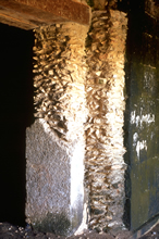 showing fallen mask stack, concrete-rubble core behind, remaining