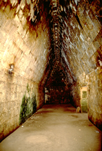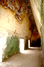 Detail of photo at left, showing sockets for two cross-beams at bottom of each side of vault.