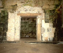 Doorway into back room, 3rd room from left; showing typical collapsed area above collapsed lintels, with new lintels and core of wall above restored.