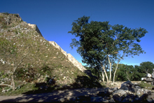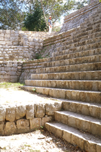 staircase, with unrestored pyramid mound.