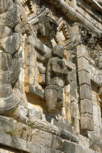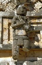 Figure said to be from facade of West Building. This well preserved figure indicates how other facade sculpture may have been finished. It is slightly more naturalistically shaped than its counterpart, more than any other sculpture at Uxmal. Note also the articulated fingernails.