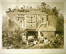 1844. Print, same section of frieze, also drawn by Catherwood. In this more glamorized chromolithograph, Catherwood has slightly straightened and reconstructed the structure. A few details are more accurate than in his print at left.