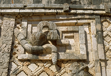 the courtyard and the east. a. The remaining head on the northern frieze remnants of one of the two serpent bodies surrounding the frieze quadrant. b. Head of the feather serpent from the damaged frieze on the southern section of the building. Now in the Museum in Merida de Yucatan."