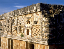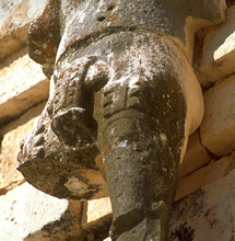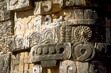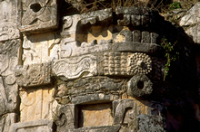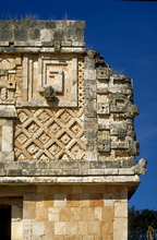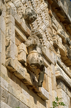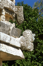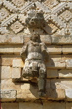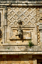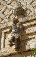 Section of frieze in center of photo at left; with figure, animal head above, and serrated latticework enclosing
