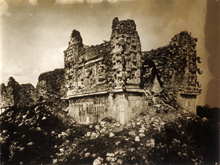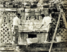 Uxmal: Nunnery, mask on facade of South Building; William Hayden and Enrique Alferez taking a cast.