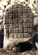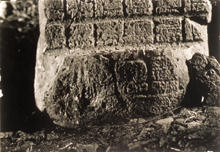 Uxmal: "Stela #20 found in 27 fragments at the foot of the stairway to the North Bldg., Nunnery" (typed on back of photo); after reconstruction by Tulane expedition.