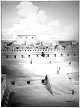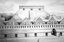 Watercolor reconstruction drawing by Tatiana Proskouriakoff, 1946. Scanned from a 35mm slide I have taken of the original watercolor drawing, yellow discoloration removed. Reproduced Courtesy of the Peabody Museum of Archaeology and Ethnology, Harvard University. |